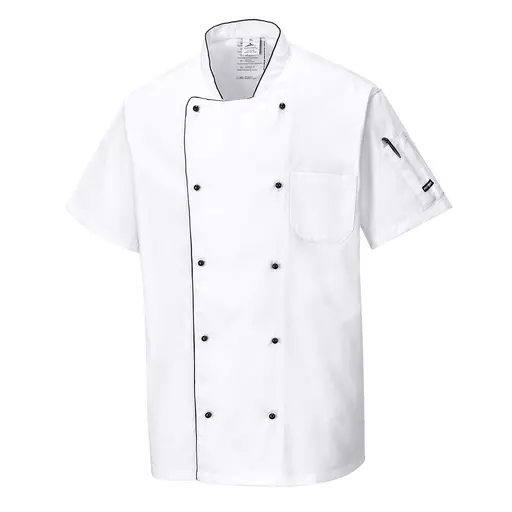 When it gets hot in the kitchen, this style provides the ideal solution. Featuring an aerated mesh section at the back, this jacket came out on top for breathability when wear tested in kitchens. Stylish piping, chest and sleeve pockets, along with button tape add to the overall style of this garment. Made from our excellent performing cotton rich fabric with anti-crease finish.