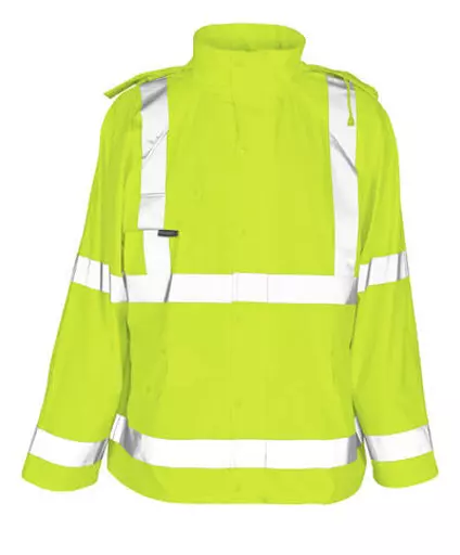 Wind and waterproof. Fluorescent with vertical and horizontal reflective tape. Welded seams. Hood with hidden drawstring in collar. Fastening with zip and storm flap with press studs. Chest pocket with flap and press stud. Front pockets with flap and press stud fastening. Ventilation in the back. Adjustable elastic drawstring at waist. Press stud fastening at cuffs.